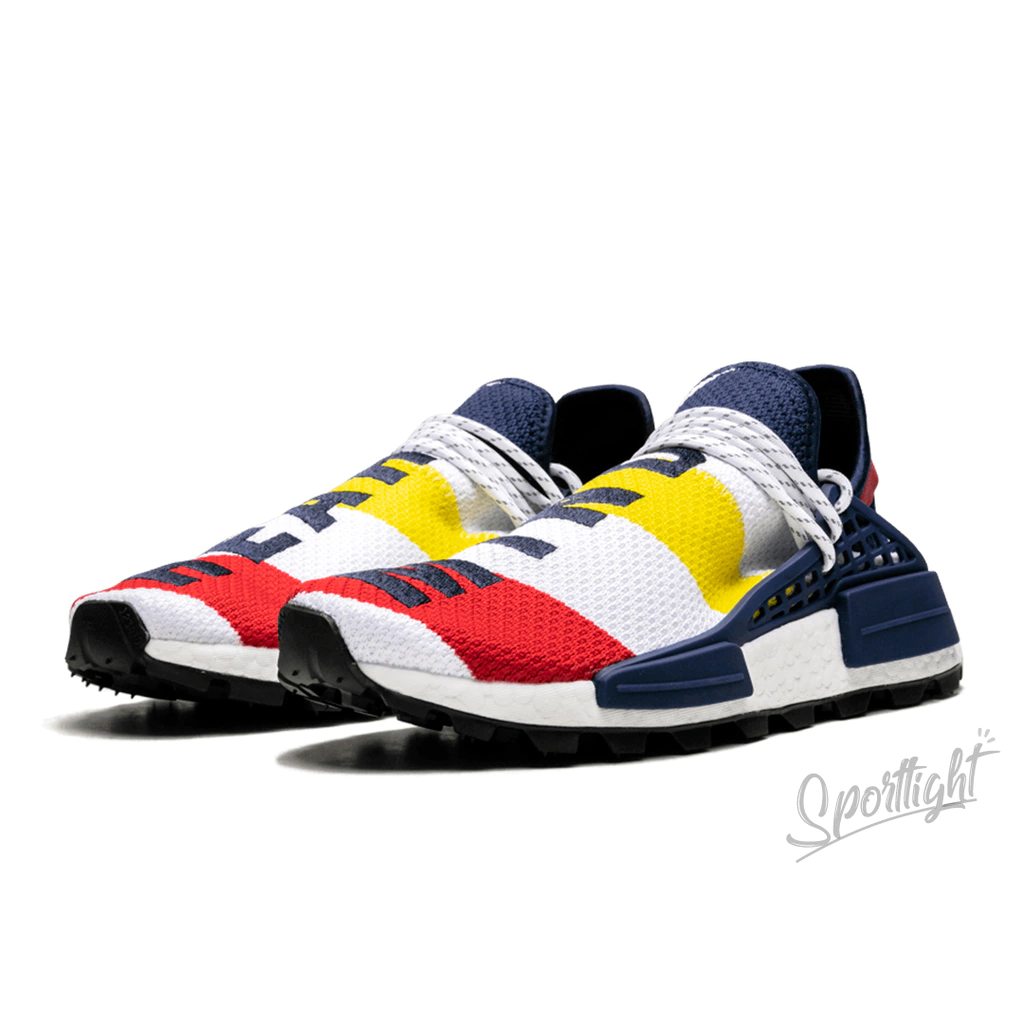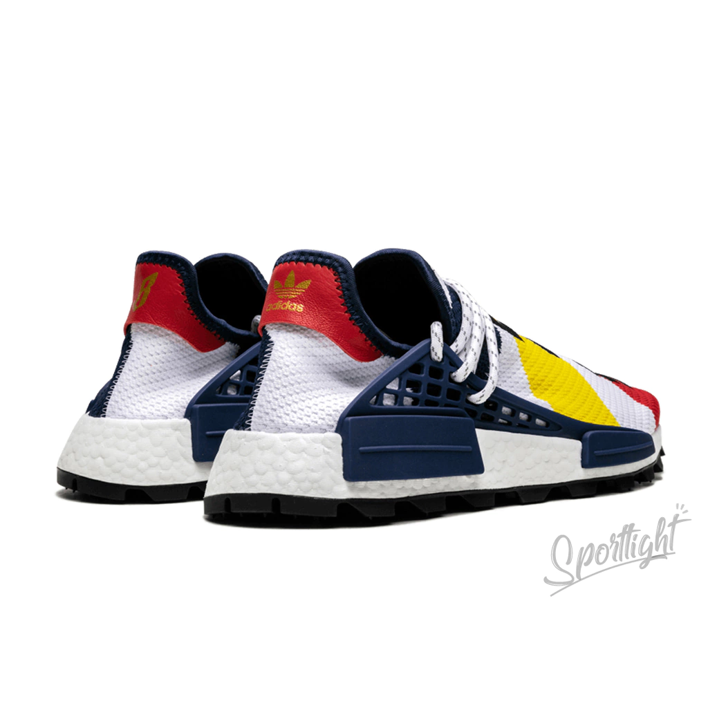 Esta abordagem colaborativa no NMD Human Race Trail apresenta detalhes de design exclusivos da marca Billionaire Boys Club de Pharrell, incluindo 'Heart' e 'Mind' bordados no vamp multicolorido da parte superior de malha de uma peça - uma referência ao slogan da BBC ' A riqueza vem do coração e da mente, não do bolso. 'Uma folha de ouro' B 'adorna a aba do salto de couro vermelho no sapato esquerdo, enquanto o direito apresenta o logo trevo da adidas.