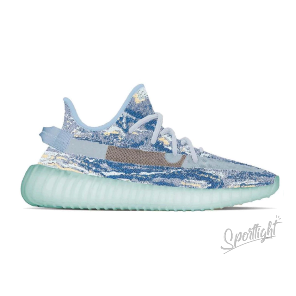 O adidas Yeezy Boost 350 V2 'MX Frost Blue' apresenta uma mistura de cores marmorizadas em uma parte superior respirável Primeknit feita com técnicas de tricô digital. Composto por uma mistura de tons de azul, cinza e creme, o pastiche multicolor é interrompido por uma faixa de monofilamento pós-tingido que corta o painel lateral lateral. Uma presilha no calcanhar facilita calçar e tirar. O tênis é montado em uma entressola Boost de comprimento total, envolto em uma gaiola de TPU tingida de azul para maior durabilidade e suporte.