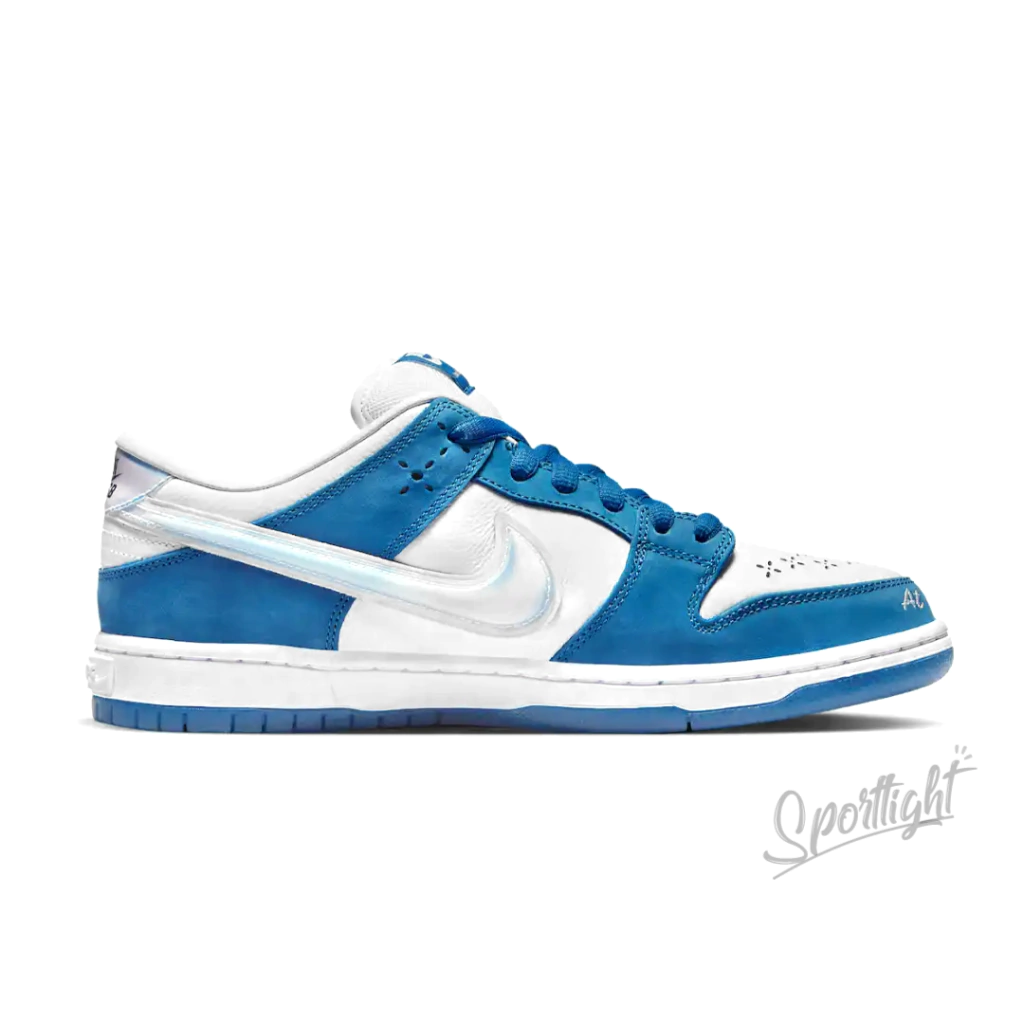O Born x Raised x Nike Dunk Low SB 'One Block at a Time' traz uma série de detalhes exclusivos para a silhueta clássica. A marca de streetwear de Los Angeles veste a parte superior em couro branco texturizado com perfurações ornamentadas na biqueira e sobreposições contrastantes de nobuck em azul Dodger. 'One Block at a Time' está inscrito na ponta de cada sapato, enquanto um emblema decorativo em bordado rosa decora o calcanhar lateral. Um efeito holográfico anima o Swoosh e a aba traseira, marcada com um logotipo lenticular Born SB. O tênis fica no topo de uma entressola de borracha branca, com letras em relevo que soletram 'On the Turf' no calcanhar. Sob os pés, a sola de borracha azul semitranslúcida revela a marca Born SB superdimensionada.
